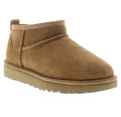 The Classic Ultra Mini updates our most iconic silhouette with a lower shaft height, adding easy on-off and enhanced versatility. Pre-treated to keep it looking better for longer, this Classic features everything you love about the original: signature sheepskin, ultra-soft UGGplush™ lining, and a flexible, lightweight sole. Wear with virtually anything – the styling options are endless. Post-Applied Treatment Treated to repel light amounts of water. Product should be re-treated periodically to maintain protection. Sheepskin Lining Vetted through extensive, industry-leading processes to ensure only the highest quality sheepskin makes the cut, delivering the signature feeling of UGG. Treadlite by UGG™ Proprietary compound which increases cushioning and traction for a supremely lightweight, ultra-durable sole.