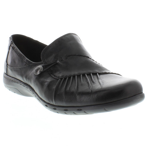 Sometimes you just need a good solid shoe for all-day comfort. But what about all-around style? This modern slip on has it all with asymmetrical ruching over the top and an antique metal button with bungee clasp for an ever so fashionable fit. A sporty look and sleek styling will carry you through your day in comfort.