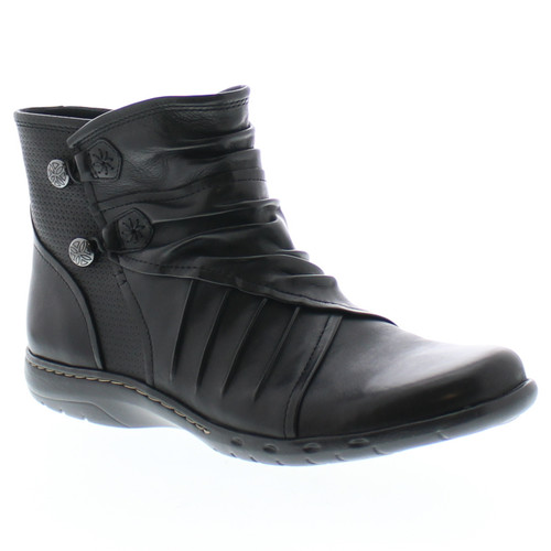 The Rockport Cobb Hill Penfield Bungie is a casual women's leather ankle boot with decorative ruched upper and metal button accents.